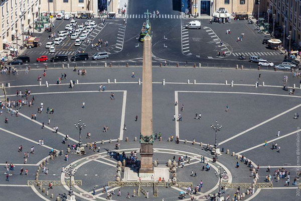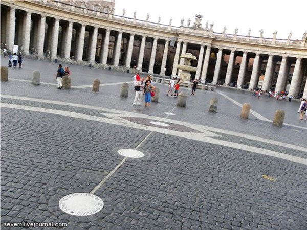 На площади святого Петра полуденная линия имеется, слева от обелиска с метками из кружков.