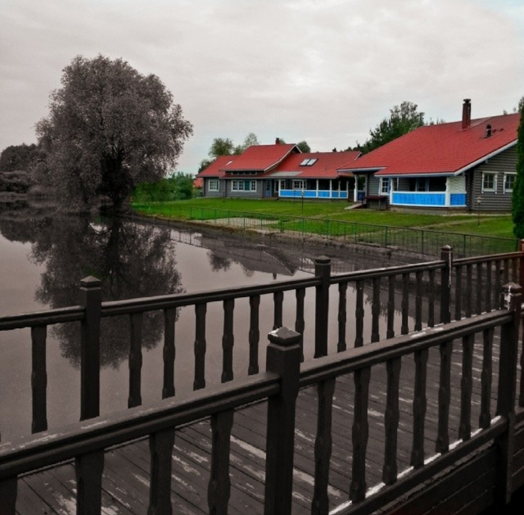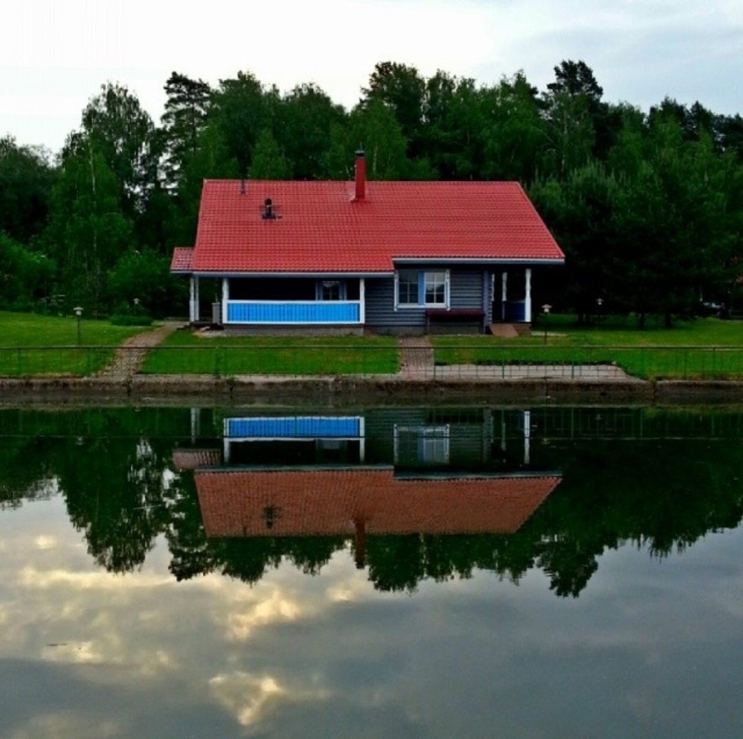 На "отражении" нет забора. Несовпадения в мелких деталях, напр. крыши. Несовпадения в отражении деревьев.