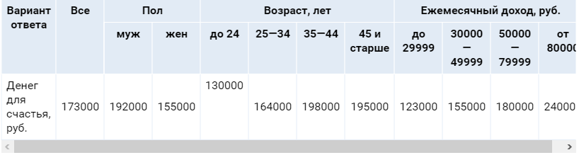 Вопрос: «Сколько денег в месяц вам достаточно, чтобы чувствовать себя счастливым человеком?» (рассчитаны средние значения, руб.)