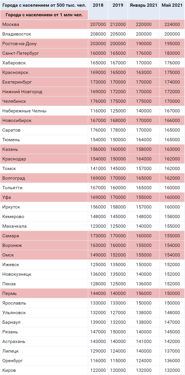 Среди жителей мегаполисов страны самые высокие денежные аппетиты — в столице. В Москве для счастья нужно 224 тыс. руб. в месяц: «Мне достаточно столько средств, чтоб не думать, как мне жить сегодня и в будущем, при этом по возможности помогая нуждающимся». Во Владивостоке — 200 тыс. руб.: «Я живу в очень дорогом городе». В Ростове-на-Дону — 195 тыс. руб.: «Ощущение счастья — структура нематериальная, можно и без денег ощущать себя счастливым. А вот чтобы была возможность помочь в росте себе, своим родным и близким не опуститься на дно, тут в любом случае нужны деньги». Санкт-Петербург — на четвертом месте со 183 тыс. руб.: «Денег много не бывает. По доходу и расход. К хорошему быстро привыкаешь». Самые скромные же притязания — у жителей Кирова (132 тыс. руб. в месяц), Оренбурга (136 тыс. руб.) и Липецка (137 тыс. руб.).