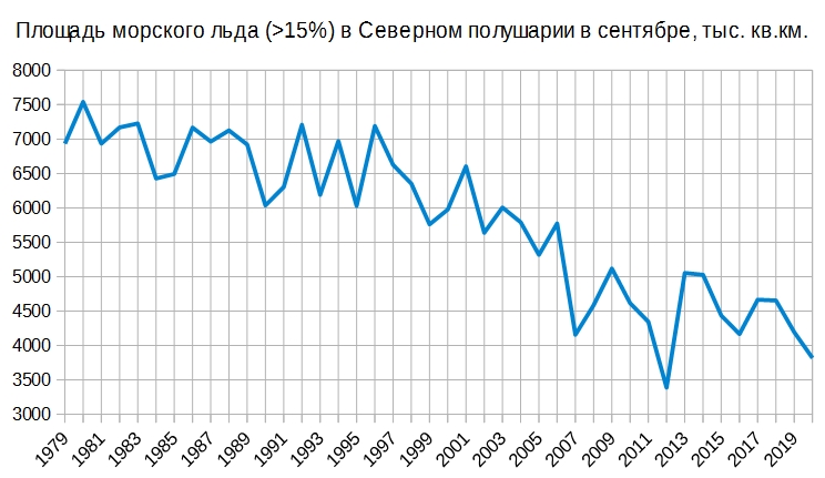 За 40 лет измерений отмечается неуклонное снижение минимума морского льда в Северном полушарии. Площадь сентябрьских заледениний сократилась более, чем в два раза: с 7,6 млн. кв. км. до 3,4 млн.кв.км.