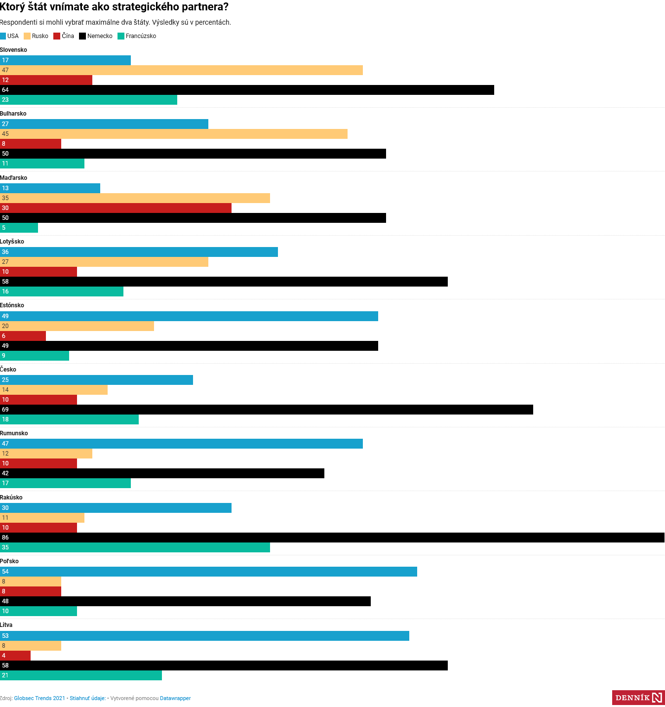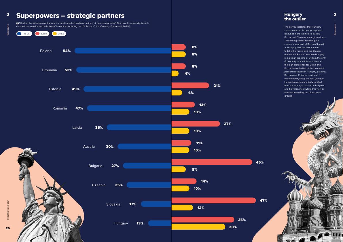 Словакия, Болгария, Венгрия вторым по значимости партнером видят Россию. Австрия вторым ставит Францию и третьим США. Китай по значимости у Венгрии третий после Германии и России, у всех остальных Китай последний."