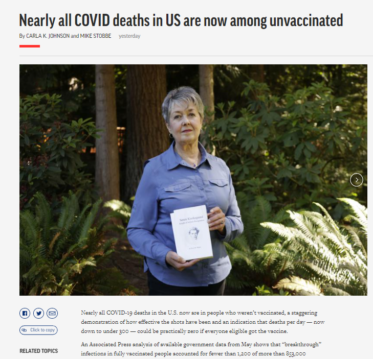 Краткий пересказ статьи "Nearly all COVID deaths in US are now among unvaccinated", опубликованной сегодня на ресурсе The Associated Press.