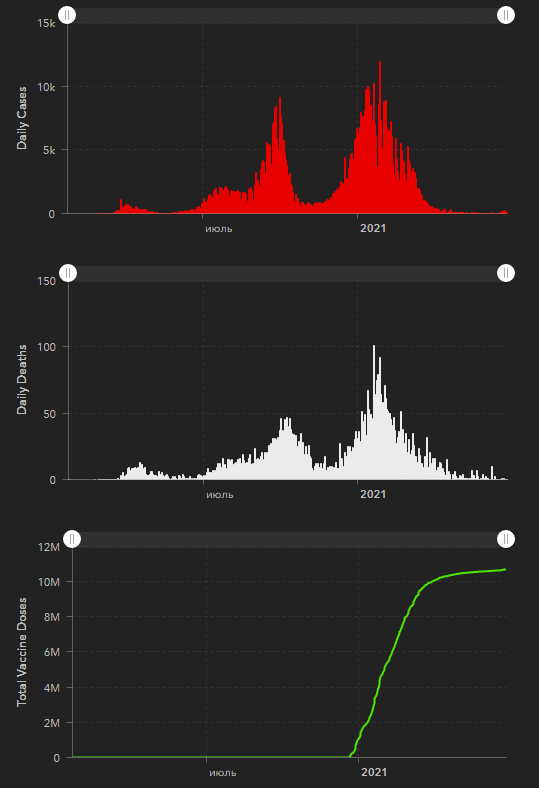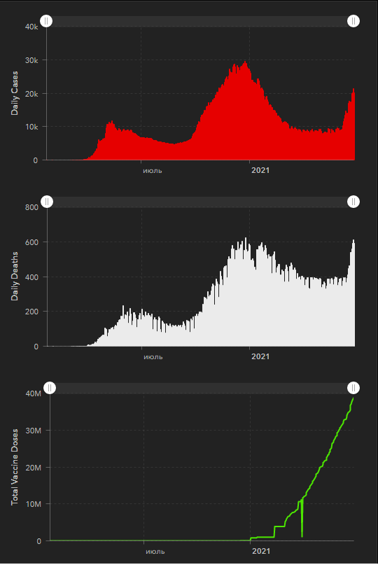 Быстро растет количество заразившихся. Дельта штамм. Но! Погибших практически нет. 20-30 чел на всю страну.