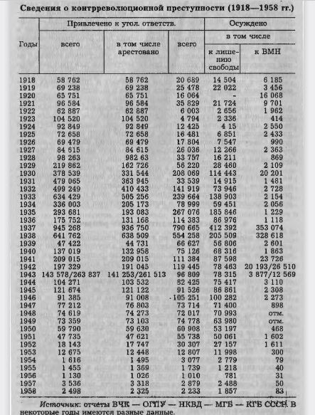 Далее он пишет, что «согласно сводной статистике, имеющейся в Отделе регистрации и архивных фондов бывшего КГБ СССР, за весь советский период (1918-1990) по обвинениям в государственных преступлениях и некоторым другим статьям уголовного законодательства аналогичного свойства были осуждены 3853900 человек, из них 827995 приговорены к смертной казни. Несколько иной информацией располагал 1-й спецотдел бывшего МВД СССР. По его статистике в период с 1 января 1921 года по 1 июля 1953 года по обвинениям в совершении контрреволюционных и других особо опасных государственных преступлений было осуждено 4060306 человек, из них 799455 – к высшей мере».
