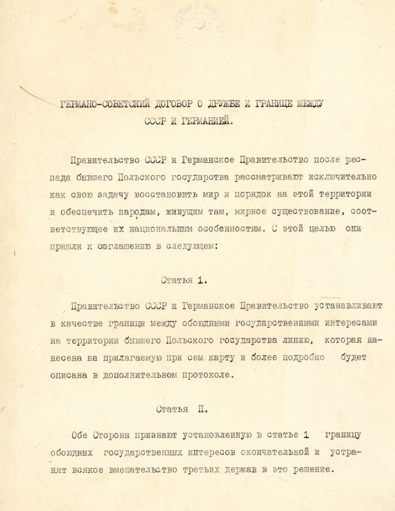 Заключенный в конце сентября «Договор о дружбе и границе» был подписан наркомом иностранных дел СССР В.М. Молотовым и министром иностранных дел Германии И. Риббентропом. Секретные дополнительные протоколы к договору корректировали сферы интересов Германии и СССР, оговорённые в секретном дополнительном протоколе к подписанному месяцем ранее советско-германском «Договоре от ненападении» от 23 августа 1939 г. Текст договора был опубликован в советской печати, дополнительные протоколы не публиковались; вплоть до 1990-х гг. часть из них была известна по копиям, снятым с утраченных во время войны германских оригиналов.