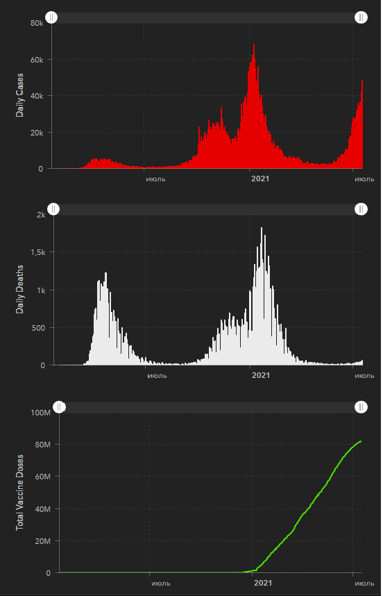 Россия - смертность за последнюю неделю 34 на 1 млн населения, вакцинация 20%