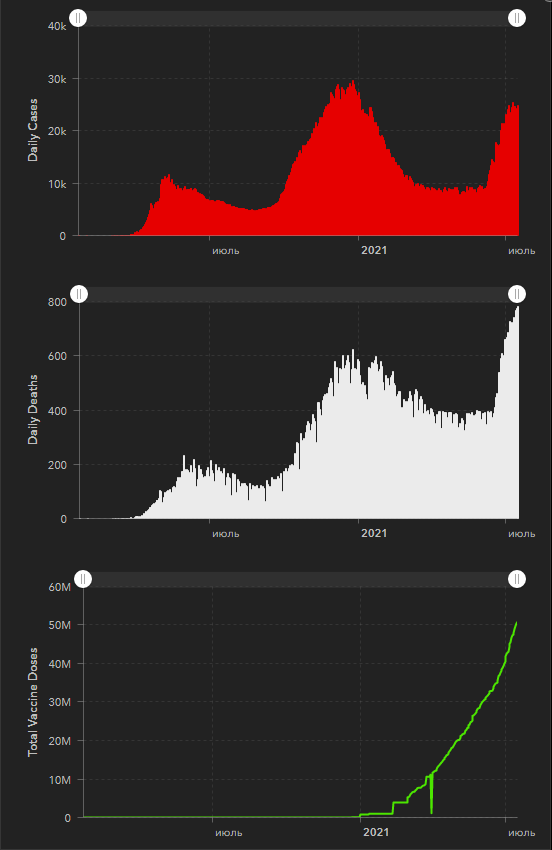 30 918 141 чел. (21.15% от населения, 44.81% от плана**) - привито хотя бы одним компонентом вакцины