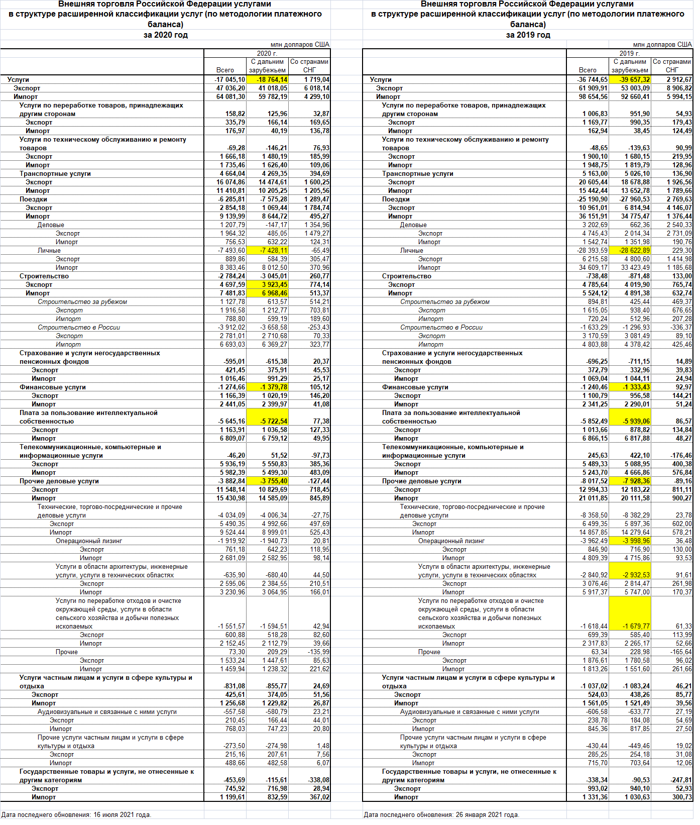 в основном за счет услуг со странами дальнего зарубежья. Здесь и личные поездки (2019 – $28,6 млрд, а 2020 всего $7,4 млрд из-за короны). И строительство в РФ иностранными строительными компаниями. И плата за интеллектуальную собственность (все эти сериалы, компьютерные игры и программы). И прочие деловые услуги.