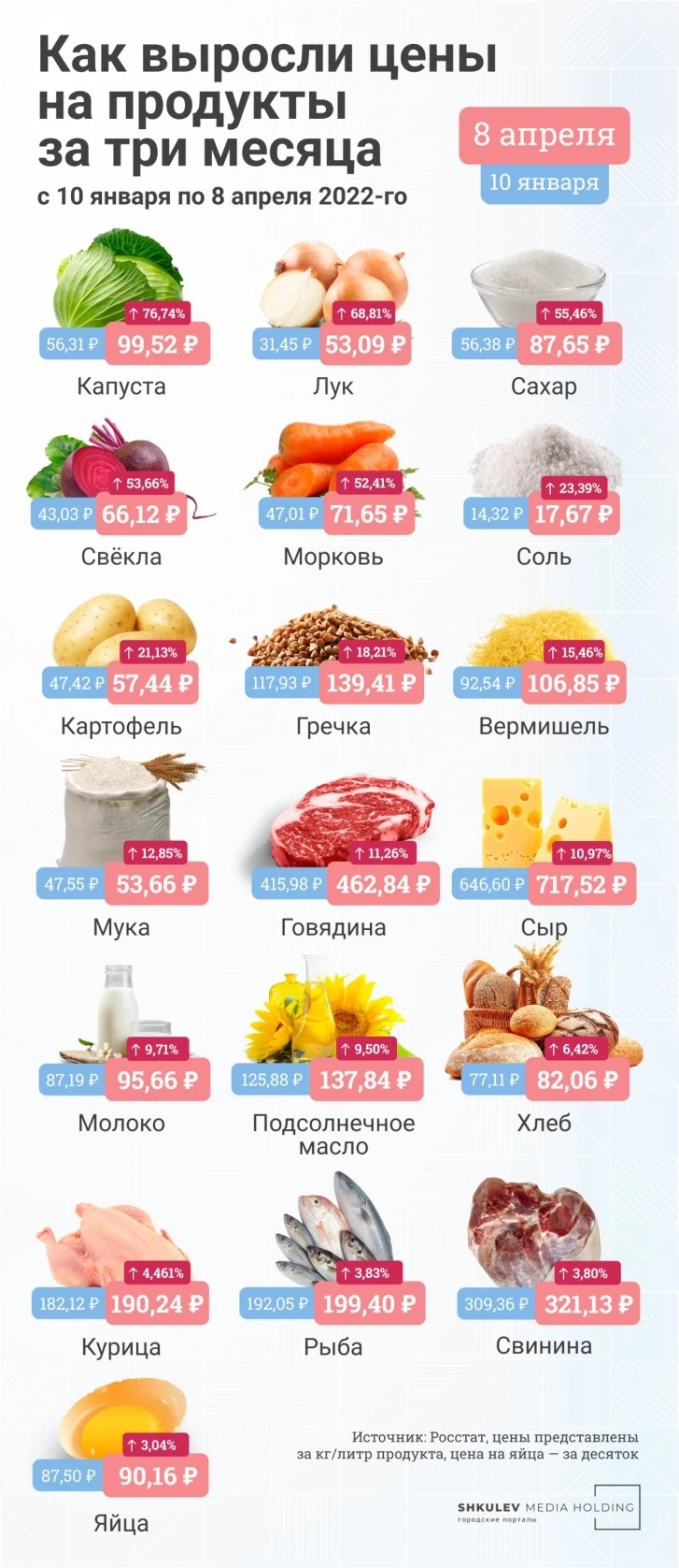 Раз в неделю ездим в деревню, возим тёще продукты, она ваще из дома не выходит. Всегда один и тот же набор: молоко, кефир, хлеб-масло, окорочка и по мелочи. Много лет такой еженедельный набор стоил 1,5-2 тыщи. Теперь от 3 тысяч и выше. За всё то же самое. Вот и не верь.