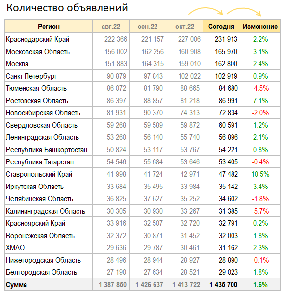 Количество объявлений заметно подросло по всей стране. В лидерах — Ставрополь и Ростов. Аутсайдеры — Калининград и Тюмень.