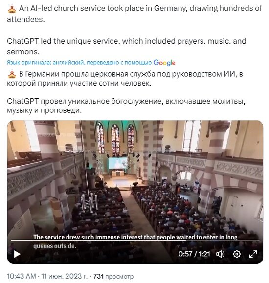 В Германии прошла церковная служба под руководством ChatGPT, в которой приняли участие сотни человек. ChatGPT провёл уникальное богослужение, включавшее молитвы, музыку и проповеди.