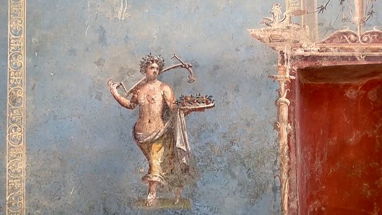 В Помпеях во время недавних раскопок в центральной части древнего города появилась новая комната с выкрашенными в голубой цвет стенами — очень редкий цвет в помпейских пространствах.