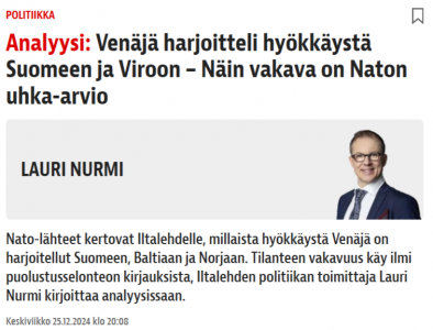 25 декабря: Источники в НАТО рассказали Iltalehti, какой тип нападения на Финляндию, страны Балтии и Норвегию разрабатывает Россия. Серьезность ситуации очевидна из записей оборонного брифинга, пишет в своем анализе политический редактор газеты "Iltalehti" Лаури Нурми.