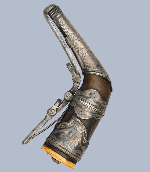 Пороховницы были неотъемлемой частью снаряжения стрелков с XV по XVIII век, до появления унитарных патронов. Солдаты и охотники носили их на поясе или через плечо. Узкий конец служил для точной дозировки пороха при зарядке оружия, а широкая часть — для хранения. Судя по богатому декору, этот экземпляр принадлежал офицеру или состоятельному военному.