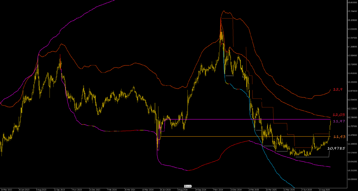 Что еще может тормознуть рост? 12,03. Это средневзвешенная цена, рассчитываемая от прошлогоднего максимума. Ну и 12,9. Это еще одна средневзвешенная цена. Уже от исторического максимума 2022 года. Именно на ней остановился прошлогодний рост. Но к тому времени, как юань дойдет до данной кривой, она может быть уже гораздо выше.