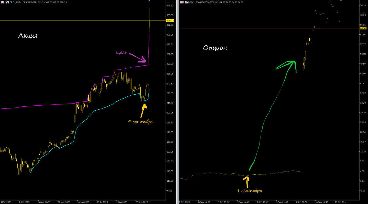 Как работал я? Я брал свои магические кривые. И накидывал на график. Что такое кривые? Это динамические ценовые границы. Т.е. те уровни, куда цена должна когда-нибудь прийти. Открываю дневной график Oracle и получаю, что цель роста – 267 (пурпурная кривая). Более того, я смотрю, что цена откатила на VWAP (средневзвешенная цена), а это точка потенциального разворота. А тут еще и отчётность. Сам бог велел покупать. И вот 9 сентября покупаю (гипотетически, я лишь объясняю принцип работы) опцион-колл со страйком 267,5. И датой экспирации 19 сентября. Эту дату взял для примера, ибо, к сожалению, опционы с более близкой датой (12.09) брокер отчего-то не показывает. А так брал бы именно их, как наиболее близкие к дате отчёта. Чем меньше опциону осталось жить, тем он дешевле, и тем сильнее будет летать. Опцион я покупаю примерно по $2,7. Выходит отчёт. И мои опционы сразу взлетают на 1700%. А спустя полтора часа и вовсе дают +2700%.