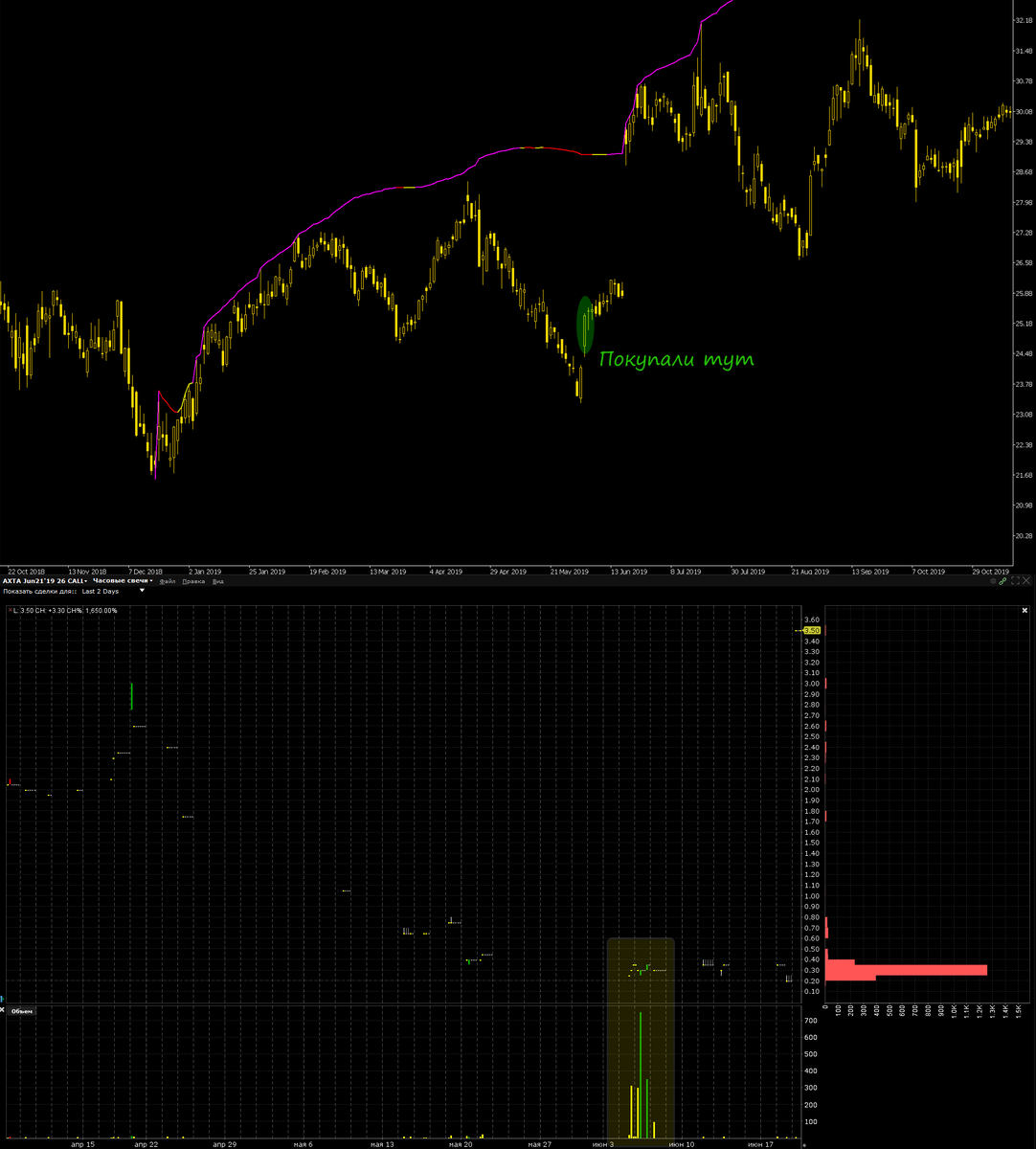 Так вот. А 4 и 5 июня кто-то ни с того ни с сего скупает опионы-колл на акции компании. Я тогда заскринил лишь один страйк – 26-й. Скуплено там было под две тысячи опционов в среднем по 0,3$. Это в лотах. Один лот – 100 опционов. Т.е. примерно на $60 000. Я не знаю, что было на других страйках. Возможно, там набирали дополнительно. Ибо 26-й страйк – это прям «на деньгах» в тот момент. Я бы брал 29-й, исходя из анализа, про который рассказывал в прошлом посте. Кстати, опцион брали с экспирацией 21 июня. Т.е. прямо знали, что 19 июня тиснут новость!