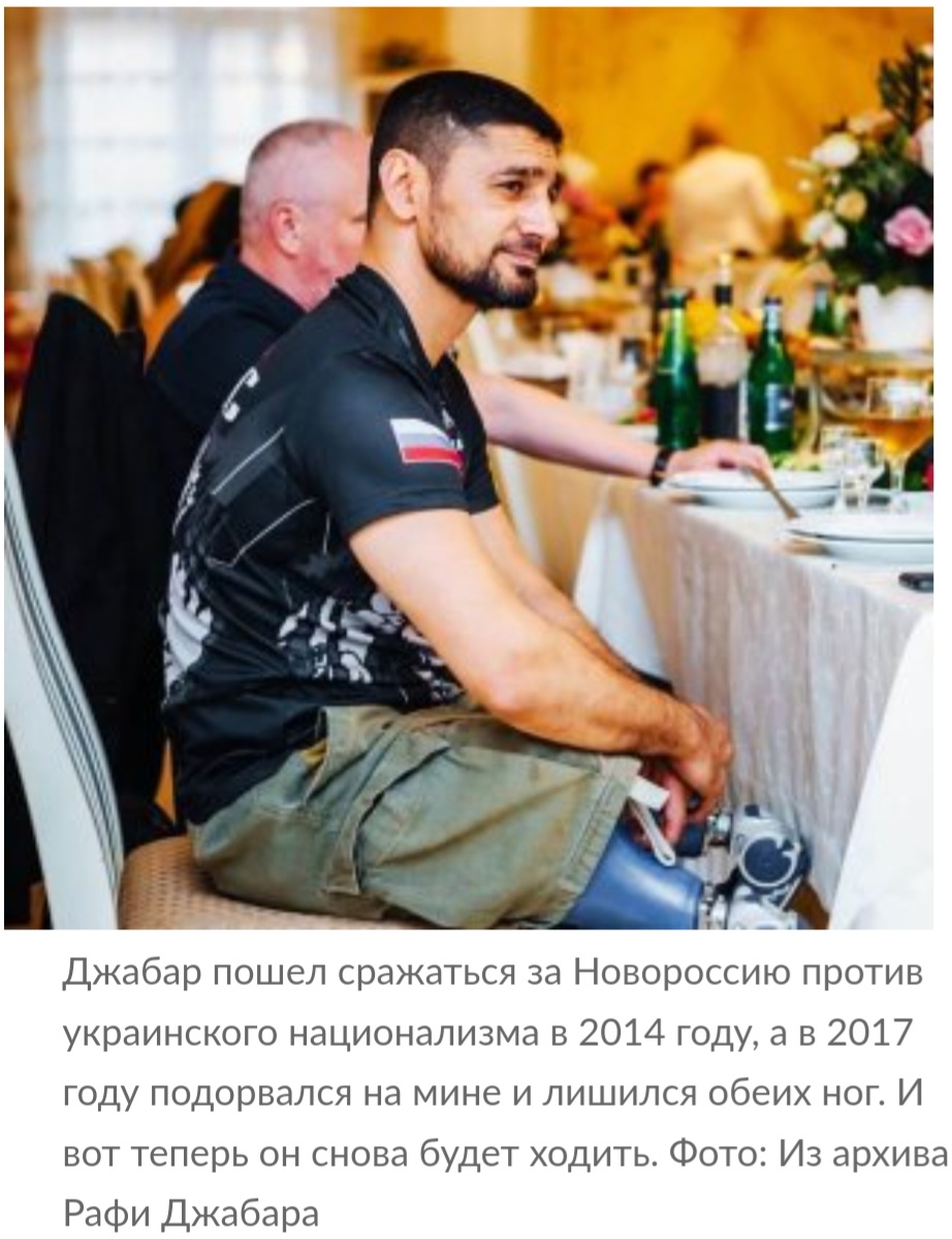 Уроженец Афганистана, снайпер Рафи Джабар с позывным Абдулла - известная личность на Донбассе. В 2014 году он пошёл сражаться за Новороссию против украинского национализма, а в 2017 году подорвался на мине и лишился обеих ног.