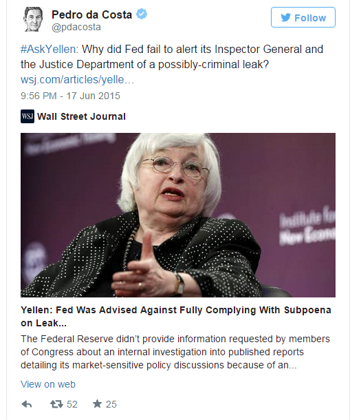 Демократия как она есть. Педро Да Коста, журналист Wall Street Journal (рупор финансовой олигархии) изгнан сегодня с работы, после того как задал главе ФРС неудобные вопросы. Вопросы, которые вызвали гнев (касались скандала, связанного с утечкой из ФРС важной информации в "свою" структуру):