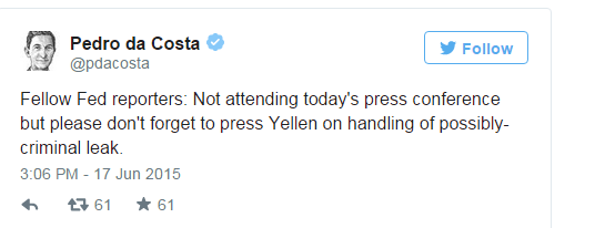 Какой первоисточник? Он просто написал сегодня в твиттере что уходит с работы. Из этого твита Zerohedge и Алекс высосали длинный пост от длинных щупальцах ФРС, которая оказывается может уволить журналиста из газеты, которая постоянно этот ФРС критикует.
