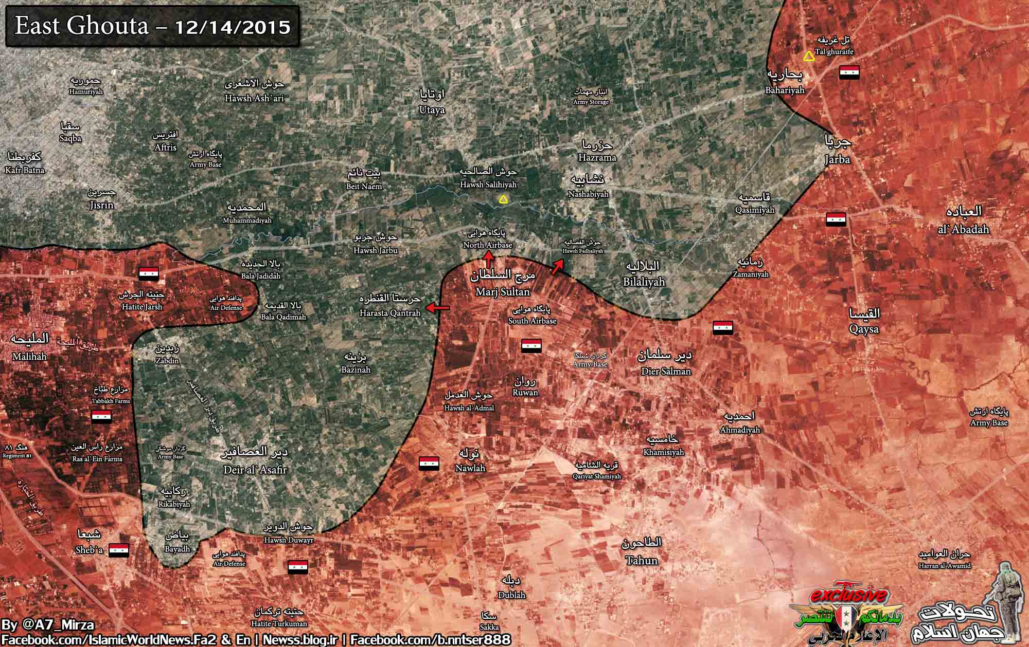 105 бригада САА в координации с национальными силами обороны (NDF) из Дамаска ввели полный контроль над деревней Эль-Мардж Аль-Султан после ряда интенсивных перестрелок с исламистскими боевиками Джаиш аль-Ислам (армия ислама) в Восточной Гуте.