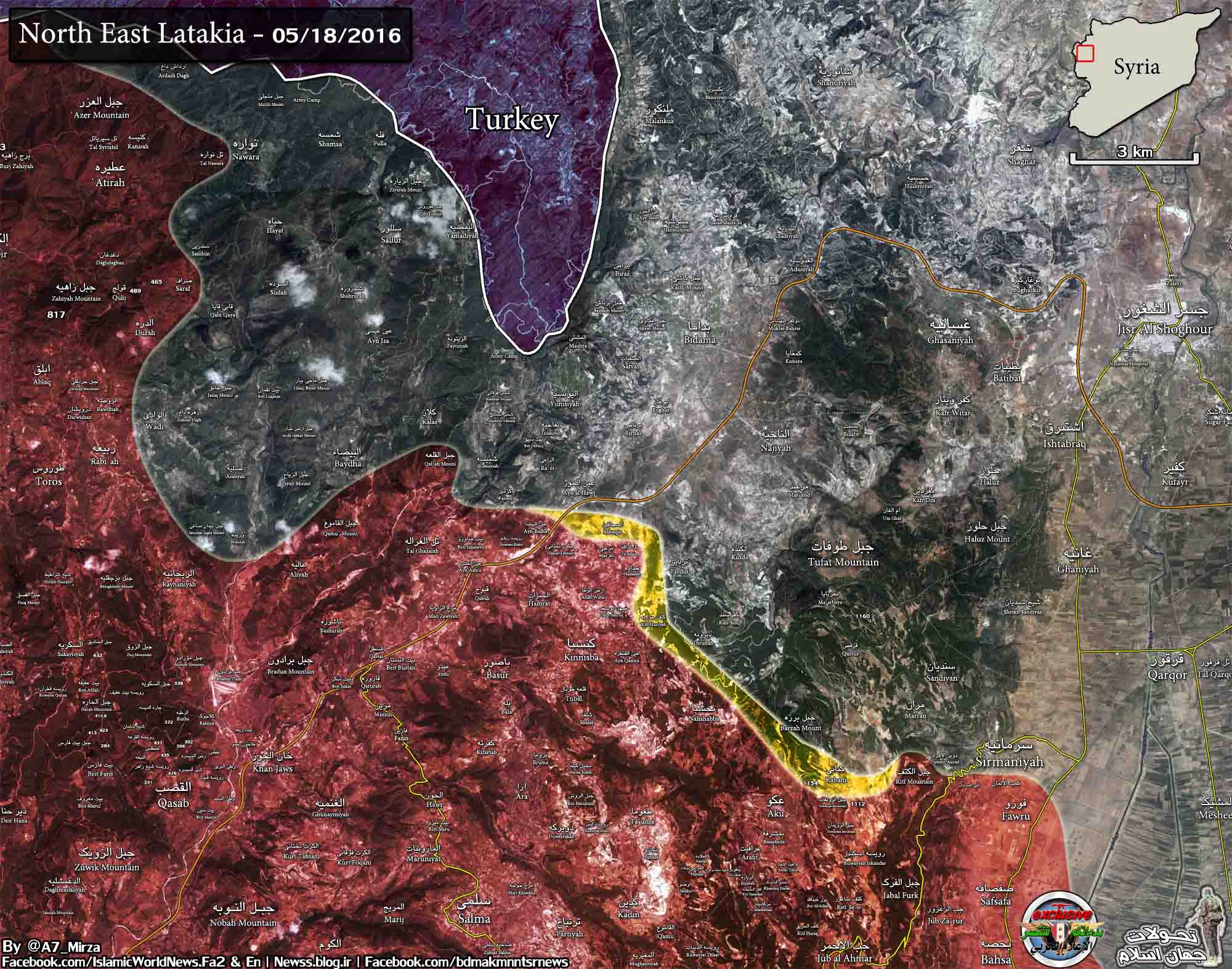 18/05/2016 Подразделения 48-го полка специального назначения, Сил национальной обороны, Сирийской социальной националистической партии (ССНП) и морской пехоты ВМС Сирии овладели высотой Телль Хаддада на севере провинции Латакия в результате упорных боёв с боевиками исламистских группировок “Джабхат ан-Нусра” (“Аль-Каида” в Сирии), “Джейш ат-Туркман” и “1-й прибрежной бригады Свободной сирийской армии”.