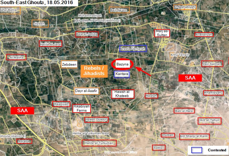 18/05/2016 Около полудня во вторник, Сирийская Арабская армия (САА) начала новую атаку в южном "мешке" Восточной Гуты (Дамаск), заняв половину села Bazinah. Кроме того, Республиканской гвардии САА, усиленная блоком Хезболла, удалось полностью захватить фермы Bazinah в течение вечера, тем самым образовав новую стартовую площадку для наступления на деревню.