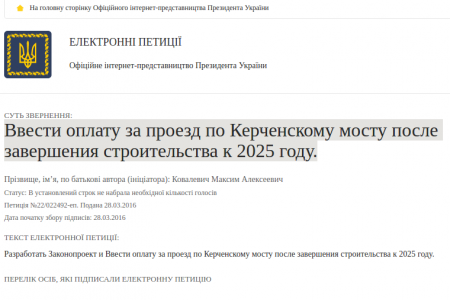 Ввести оплату за проезд по Керченскому мосту после завершения строительства к 2025 году. 1.3K 22:16 - 29/Июл/16 Арахнолог (10 лет 4 месяца) https://petition.president.gov.ua/petition/22492