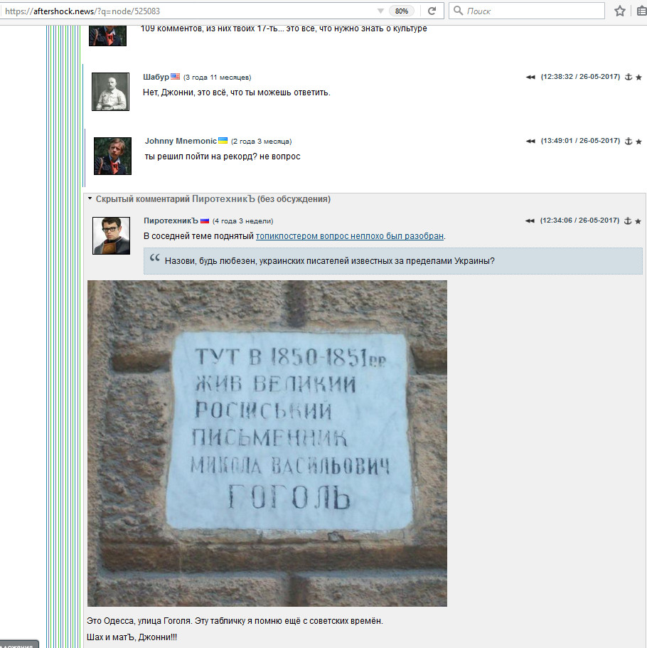 Это Жонны МнимонЫк, сегодня он запилил очередной "разобличительный" пост на заданную тему (можете посмотреть мой профиль - он у меня в бан листе). Один из лидеров бан-рейтинга на АШ. Зимой топил за флешмобы на бУкре с советскими песнями. Мало того, он СЕКтант, прёт его агрессивно от Пургеняна, срачи были эпические. Навыки комфортного поведения у него недоразвиты - чуть что начинает про штанишки и какашки, иную точку зрения воспринимает как покушение на личную территорию, самовлюблённо самоцитируется.
