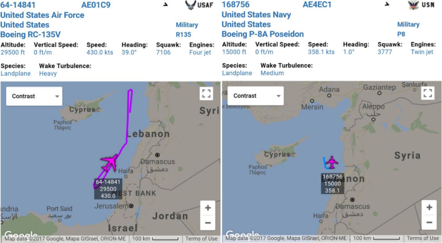 Американцы задействовали три самолета разведчика постоянно присутствующих в регионе RC-135U и RC-135V а также P-8 Poseidon. Посейдон специализируется на обнаружении и уничтожении подводных лодок противника в районах патрулирования, разведки, участия в противокорабельных и спасательных операциях, а самолеты разведчики на стратегической радиоэлектронной разведке, радиоперехвате, отслеживания активности неприятельских сухопутных, морских и воздушных сил.