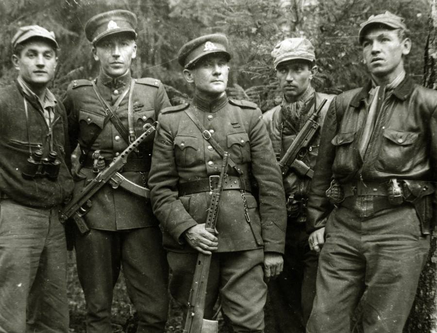 Это довольно известное фото. На нем гражданин в фуражке это Викторас Виткаускас. Командир лесных бандитов. А еще трое - выпускники диверсионно-разведывательной школы, которая находилась в немецком городе Кауфбойрен. Школу эту, ясное дело, курировала американская разведка. Ну как сегодня НАТОвцам не любить своих выкормышей? Юозас Лукша, Бенедиктас Трумпус и Клеменсас Ширви сделали фото сразу после заброски в СССР.