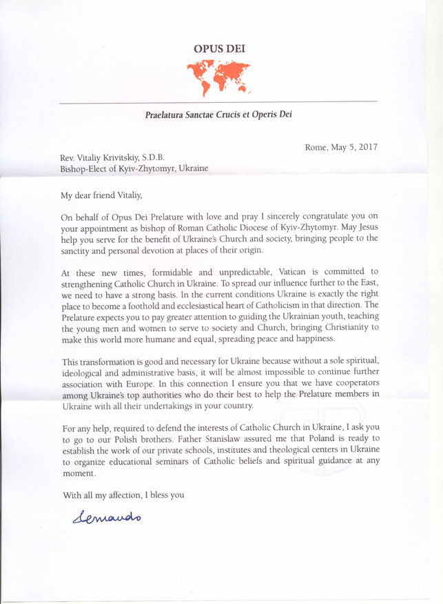 Как стало известно из письма прелата Opus Dei монсеньора Фернандо Окариса назначенному в конце апреля 2017 года епископу диоцеза Киева-Житомира отцу Виталию Кривицкому, Украине в процессе распространения католицизма на Восток отводится ключевая роль.