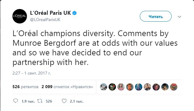 "L'Oreal поддерживает многообразие. Комментарии Бергдорф расходятся с ценностями компании, и мы приняли решение прекратить сотрудничество с ней", — говорится в сообщении.