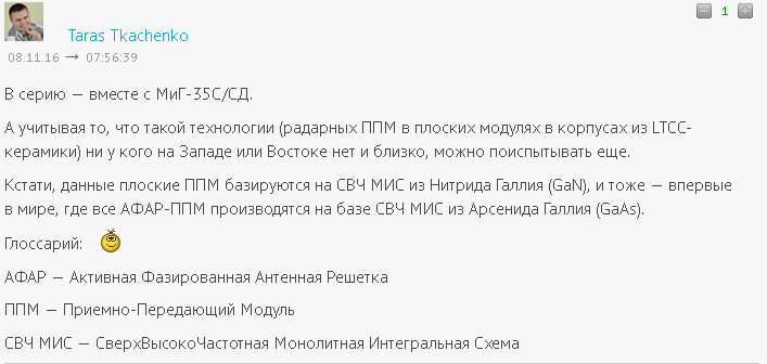 Научитесь понимать написанное. Поциент написал - "и до сих пор его на миг-35 нет. на дворе 2017 и миг-35 принимают на вооружение без афар." Я ответил.