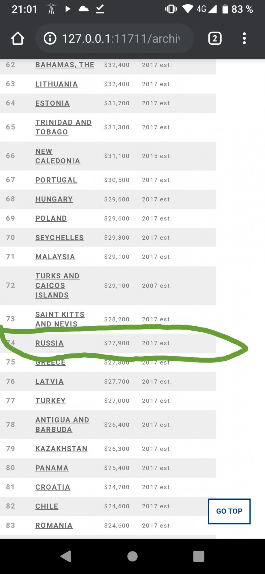 And to understand this, just look at the data on Russia and China, that is, those countries that make you feel jealous. For example, you show that the per capita GDP by PPP in Russia in 2019 (but in 2010 prices) was $ 12842. In China, 8041 dollars. In the United States - 55761 dollars. These figures would be at least somewhat similar to the truth if we were talking about GDP calculated at the exchange rate. But you write that we are talking about GDP by PPP (just in 2010 prices). But this is ridiculously absurd! After all, if you find in the archive of your site data for 2010, the total GDP by PPP in 2010 in Russia was 2229 billion dollars, China 9872 billion, and the United States 14720 billion.But if you divide this data by the population, it turns out that for 9 years the economy Russia DECLINED, and China almost did not grow! Are you kidding? In China, which over the years has become an economic superpower in 9 years economic growth...STANDING STILL?!y?! But this absurdity can make even a 5-year-old child or even a radical critic of China laugh! From year to year, you published absolutely adequate figures of per capita GDP in PPP, but at the end of 2020, you decided to immediately replace them with fake bull shit, which can only cause shame for the one who publishes it. In this new ranking, with a click of your fingers, you "reduced" the per capita indicators of Russia and China by more than 2 times compared to what you yourself published a couple of months ago! And they replaced them with invented numbers that can not be found in any database in the world, neither the IMF, nor the World Bank, nor the OECD. You put Russia on the 100th place in terms of GDP per capita in PPP, one step lower than that...Mongolia! Mongolia! You put China on 128th place, while you put Libya on 126! A country that has been reduced to rubble by years of civil war. Who is this madness designed for?!