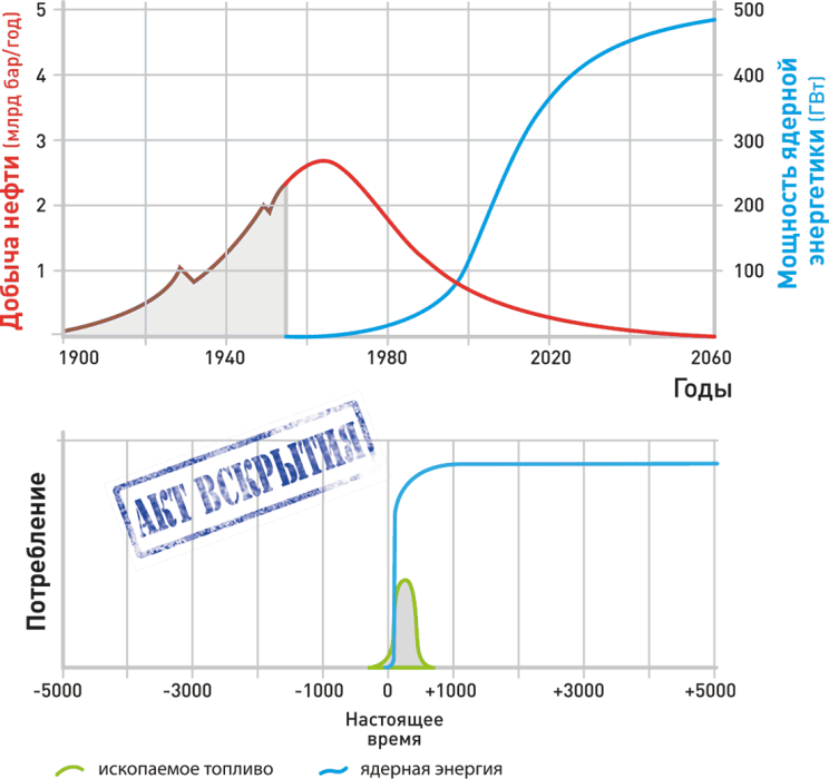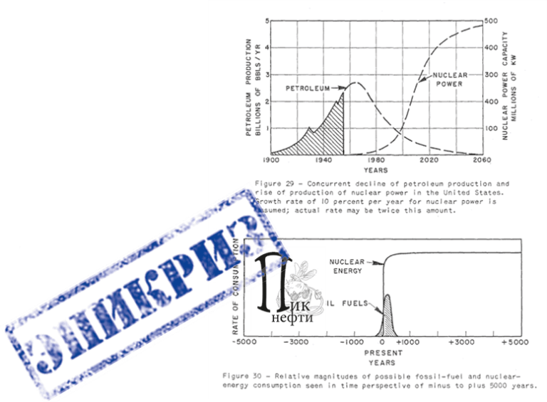Оставим за кадром ту наивную горизонтальную полочку для «атомной энергии» (nuclear power), которую нарисовал Кинг Хабберт в отдаленное, неизвестное для него будущее, которое уже стало для нас повседневным настоящим. Интересно другое – сейчас просто удивительно, как можно было в далеком 1956 году написать столь смелую тогда и настолько точную сейчас по итогам работу. Причем – опираясь лишь на доступный в середине 1950-х, скудный и неполный массив исходных данных о запасах нефти. Даже вопрос перехода на атомную энергию тогда еще был пророческим, ведь первая атомная электростанция появится в США только через год, а СССР к моменту написания Хаббертом доклада всего лишь два года, как запустил первую экспериментальную атомную станцию в Обнинске. И, надо сказать, патологоанатом из Хабберта получился просто-таки замечательный.