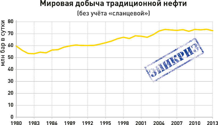 Как видите, разница в усредненных цифрах роста добычи и потребления нефти за 1970-е, 1980-е, 1990-е и 2000-е уже позволяла сделать весьма неудобный для мира прогноз. Картинка показывает нам ровно то, о чем говорил Хабберт в 1956 году. Злополучный пик традиционной нефти. Ту самую «планку» последней части S-кривой, о которой мы уже рассказали и которую весь мир безуспешно штурмовал все 2000-е годы. На самом деле в мире еще в районе 1990-х сломало вторую производную (ускорение) роста добычи нефти и сейчас, на наших глазах, добивает уже первую производную (скорость). И все попытки ускорить производство нефти в 2000-е годы закончились ничем – нефть росла на 0,1 % в год, то есть уже вполне в рамках погрешности измерений. А сейчас, как только скорость роста добычи нефти во всем мире станет отрицательной, это уже будет не рост, а падение.