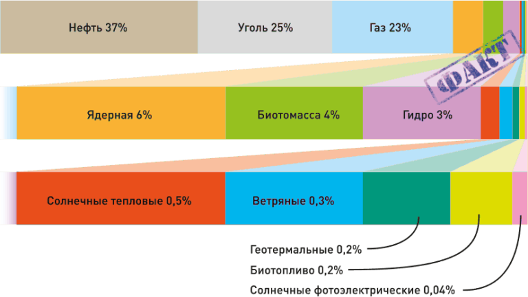 В рамках всего мира возобновляемой энергии, вместе с ураном, который дает нам целых 6 % энергии – не более 10 %. Из этих «не более 10 %» у нас 4 % заключено в энергии дров и соломы и 3 % – в энергии гидроэлектростанций. Ну а все остальное – фотоэлементы, ветряки, жидкие биотоплива и геотермальная энергия дает и вовсе около 1 % в общее производство энергии. А львиную долю(а это без малого 85 % – минеральные топлива) обеспечивают нам нефть, уголь и природный газ.